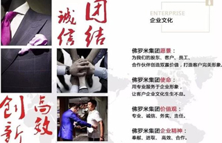 佛羅米服飾集團是一家以服裝為龍頭產業的大型集團企業,同時還涉及了高端形象定制、金融投資、文化傳媒、建筑裝飾、國際貿易、網絡商城等行業,公司以多元并進、專業化發展的經營格局,成為大型集團公司。集團旗下廣東佛羅米服飾集團有限公司注冊資金1.68億元,總資產四億八千萬元,現有員工1300人。